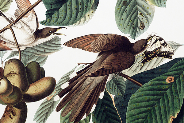 “[These birds] resort to the deepest shades of the forests, and intimate their presence by the frequent repetition of their dull and unmusical notes. . . . These notes may be represented by the word cow, cow repeated eight or ten times with increasing rapidity. In fact, from the resemblance of its notes to that word, this Cuckoo is named Cow Bird in nearly every part of the Union. The Dutch farmers of Pennsylvania know it better by the name of Rain Crow, and in Louisiana the French settlers call it Coucou. It robs smaller birds of their eggs, which it sucks on all occasions, and is cowardly and shy, without being vigilant. On this latter account, it often falls a prey to several species of Hawks. . . .”