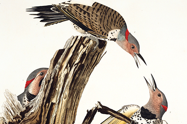 “This species, which is usually called Pique-bois jaune by the French settlers in Louisiana . . . is one of the most lively of our birds, and is found over the whole of the United States. . . . [After mating they] climb about and around the tree with apparent delight, rattle with their bill against the tops of the dead branches, chase all their cousins the Red-heads, defy the Purple Grakles to enter their nest, feed plentifully on ants, beetles and larvae, cackling at intervals, and ere two weeks have elapsed, the female lays either four or six eggs, the whiteness and transparency of which are doubtless the delight of her heart.”