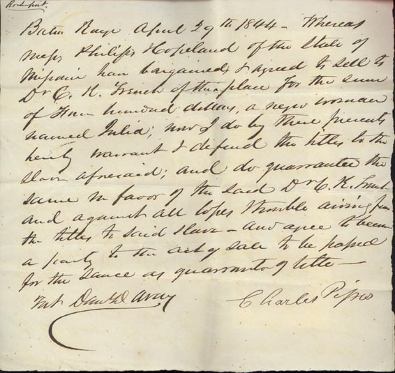 Twenty-five African slaves and two whites resided at the first settlement in Baton Rouge, founded in 1718. By 1860 the white population of Baton Rouge was 5,429, with a slave population of 1,247. As the hand-written bill of sale shows, slaves were bought and sold among the white citizens. During the Civil War, slaves brought within Union territory were known as contrabands. A broadside notes rules for them. After the Civil War, the number of African-Americans increased in Baton Rouge (52% in 1865 and 59% by 1880), but their lives barely improved. Rigid segregation was enforced throughout the century. Even blacks serving in the state legislature were banned from local business establishments. Stereotypical images of African-Americans, such as the Longwood Plantation advertisement, were common. No public education was available for black children until 1905. Only federal desegregation suits in the last half of the 20th century forced equal public education for African-Americans in Baton Rouge.
