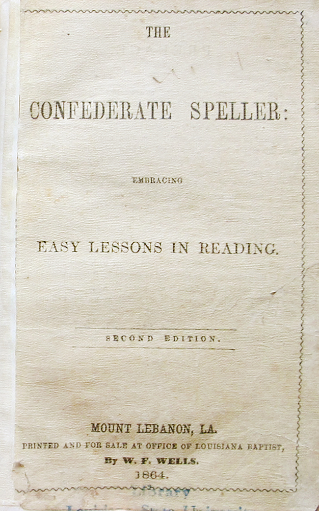 A similar work is The Confederate Speller, published in nearby Mount Lebanon. Commenced by William W. Womack, a professor of English at the short-lived Mt. Lebanon University, the work was based on Noah Webster’s Elementary Spelling Book. Like the Louisiana English Grammar, it is largely free of Confederate themes but was intended as the first in a series of books “by which it is proposed to supplant an unwholesome supply from alien and inimical sources.” Two penciled notes record that it was used by members of the Upton family in Homer and Arcadia, Louisiana, in 1864-65.