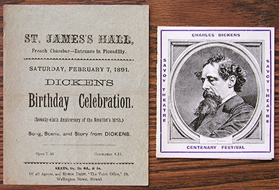 Two programs from earlier Dickens birthday celebrations are shown below. The 1891 celebration featured “song, scene, and story from Dickens.” The Savoy Theatre’s 1912 centenary celebration of the author's birth was organized by three of his children. It was “inaugurated to give an opportunity to our cousins from beyond the Seas, by whom Charles Dickens is so greatly revered and honoured, of witnessing upon the stage of the Capital City of the Empire, the loved and never-to-be-forgotten characters created by the immortal novelist.”