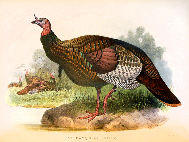 Some turkeys, however, traveled the world. The remote island of St. Helena in the South Atlantic had free-range turkeys on it by 1588, even before it had permanent human residents. Portuguese sailors, realizing there was little meat on the island, probably left the flightless birds there while traveling to India so they would have food when they came back. Turkeys were marooned on other islands as well. And, of course, Europeans left turkeys in inhabited places, too. When Captain Cook stopped at Tahiti in 1777, for example, he gave turkeys and other domesticated animals to the islanders, partly as a gift, partly to ensure future food supply for other travelers. Shown here are a few gorgeous gobblers from the McIlhenny Natural History Collection, which supports study in a wide range of disciplines, from science to social history. If you have any questions about the collection, feel free to contact us! Further reading: Andrew F. Smith, The Turkey: An American Story (2006) Joyce Oldham Appleby, Shores of Knowledge: New World Discoveries and the Scientific Imagination (2013)