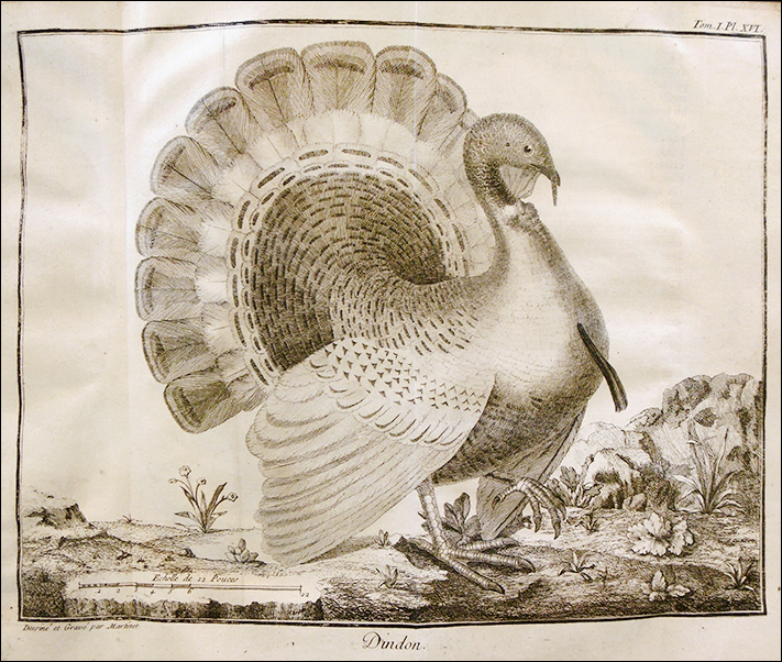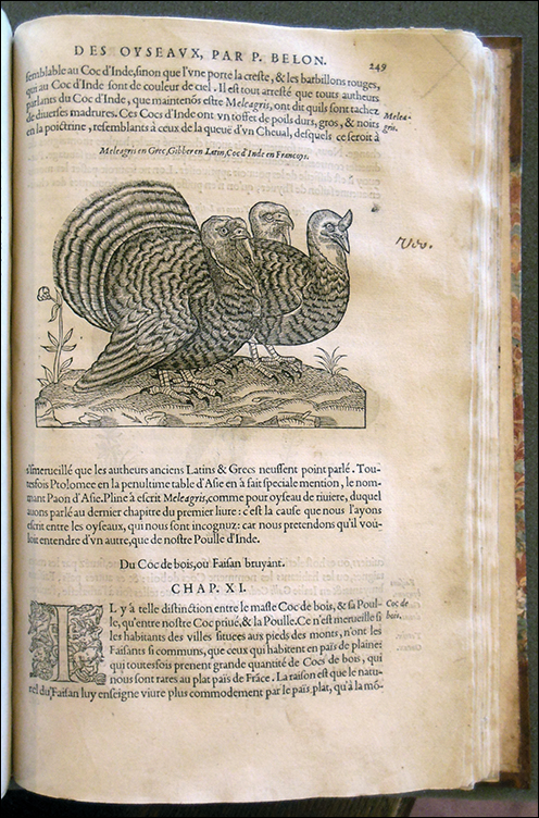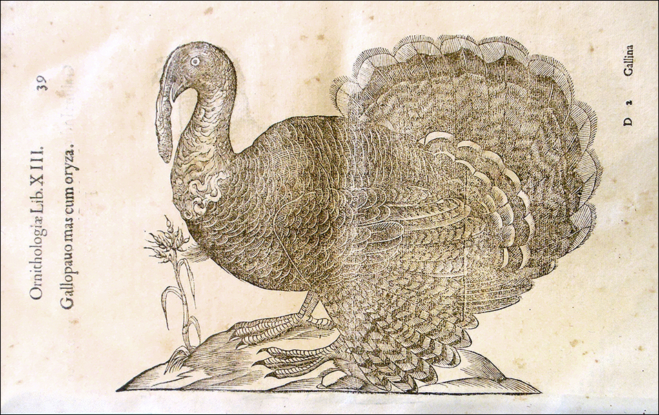 Even if you won’t be roasting a turkey at Thanksgiving later this week, there’s no denying that this iconic bird has become part of the American story. Other than on “Turkey Day” itself, however, is eating turkeys as uniquely American as we think it is? The idea that Benjamin Franklin wanted a turkey, rather than a bald eagle, to be the national symbol of the United States is well known but probably a myth (or at least an exaggeration). Nevertheless, the bird did come to be identified with the New World, where it originated. What few Americans today realize is that the turkey was also one of our first expatriates. By the time the Founding Fathers were supposedly caught up in the turkey versus eagle debate, Europeans had been raising and eating turkeys for over 250 years. Christopher Columbus encountered birds that might have been turkeys, but his description of them is vague. Spanish explorers in Central America sent turkeys back to the Caribbean in the early 1500s. The first turkey probably reached Spain in 1519. A year later, one was sent to an Italian cardinal—with instructions not to eat it. By 1557, turkeys were so common (and apparently such a nuisance) in Venice that a special tax on them was passed. A pollo d’India (“chicken of the Indies”) shows up in a Roman fresco painted in 1523. Around 1560, Cosimo de’ Medici, the Grand Duke of Tuscany, ordered a life-size sculpture of a turkey for his villa near Florence. His cousin Catherine de’ Medici, the Queen of France, served seventy turkeys at a Paris banquet in 1549, six years before the first published depiction of a turkey was included in the book shown below, Pierre Belon’s L’histoire de la nature des oyseaux. (The first depiction of a turkey in a cookbook was printed in Germany in 1581.)