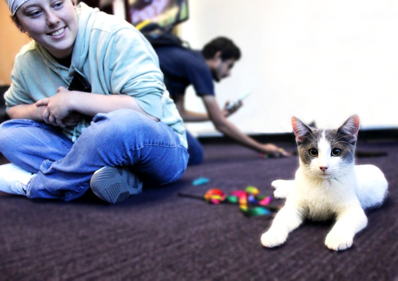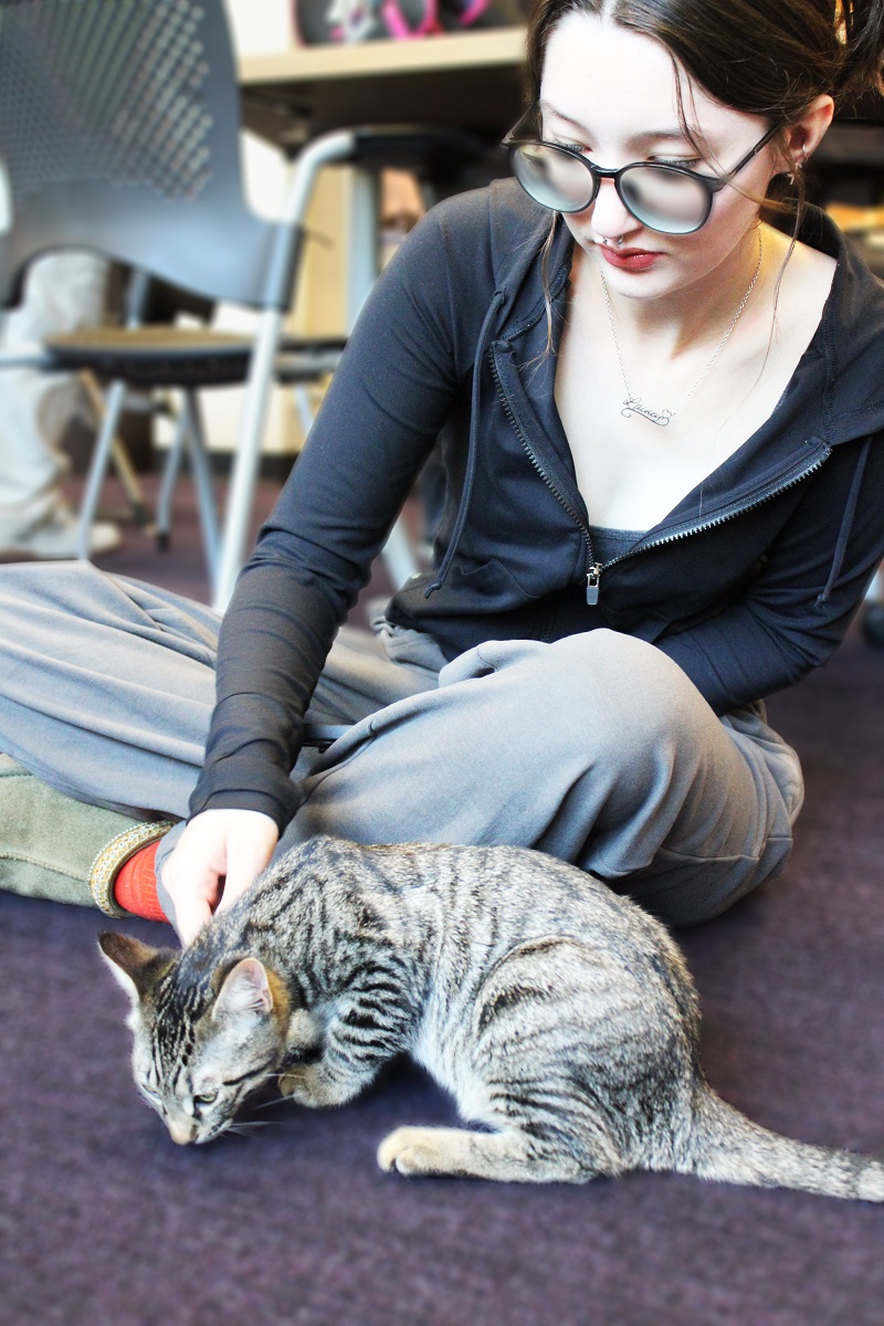Like Dog Therapy, the goal of the Cat Café was to create a fun, safe space for students to unwind during the academic grind, and they jumped at the chance: a whopping 300 students registered for the event.