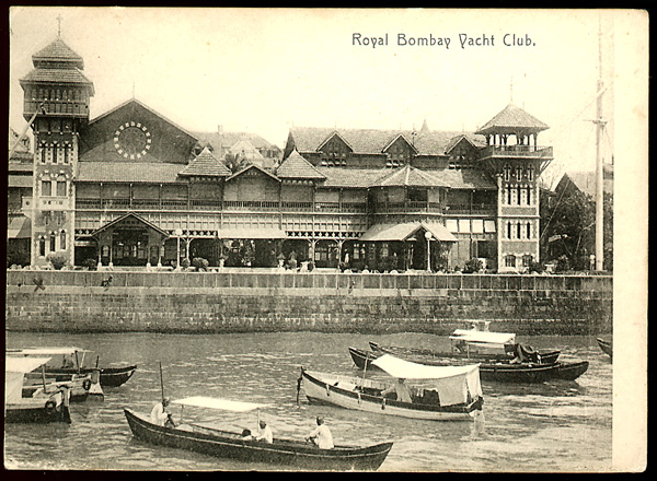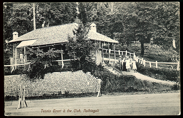 Two clubs: British Indian clubs might be as grand as the "Royal Bombay Yacht Club" or as simple as that in a smaller station, such as "Tennis Court & the Club, Nathiagali"; postcards; early 20th century. On the reverse of the Bombay Yacht card a correspodent has written: "A lovely club. People have tea parties on the lawn (behind the wall)."