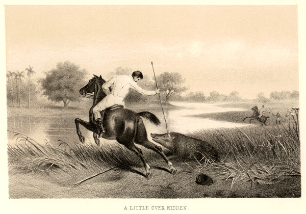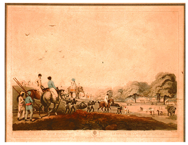 Hog hunter, probably along the Ganges River. The sport of hog hunting (or "pig sticking") involved chasing on horseback and spearing dangerous wild hogs. Though limited geographically, the sport had a very popular image, perhaps because it seemed to evoke ancient ways and almost feudal methods of organization.