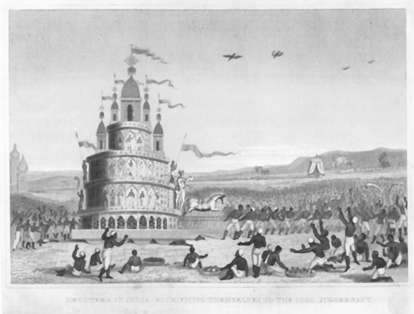 And there were many accounts of the Jaganath procession, in which the Hindu deity was pulled on a cart by devotees, some of whom were crushed beneath it in an excess of religious fervor. Such customs could serve to suggest fanaticism, social instability, and the continuing need for British rule to control such excesses.