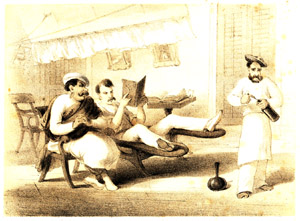 Because they needed to conduct business in Indian languages, British soldiers and administrators labored to acquire local vernaculars, through the aid of a munshi or language instructor. Atkinson's lithographs depict with dry humor life in a "typical" English "station" in the second half of the 19th century.