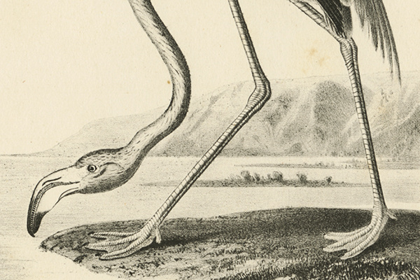 “On the 7th of May 1832, while sailing from Indian Key, one of the numerous islets that skirt the south-eastern coast of the Peninsula of Florida, I for the first time saw a flock of Flamingoes. It was on the afternoon of one of those sultry days which, in that portion of the country, exhibit towards evening the most glorious effulgence that can be conceived. The sun, now far advanced toward the horizon, still shone with full splendour, the ocean around glittered in its quiet beauty . . . Far and away to seaward we spied a flock of Flamingoes advancing in ‘Indian line,’ with well-spread wings, outstretched necks, and long legs directed backwards. Ah! Reader, could you but know the emotions that then agitated my breast! . . . I followed them with my eyes, watching as it were every beat of their wings; and as they were rapidly advancing towards us, Captain Day, who was aware of my anxiety to procure some, had every man stowed away out of sight and our gunners in readiness . . . suddenly, to our extreme disappointment, their chief veered away, and was of course followed by the rest . . . the Flamingoes were all, as I suppose, very old and experienced birds . . .”