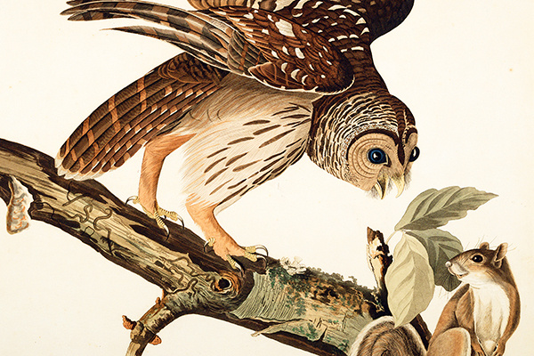 “Should you, reader, find it convenient or agreeable to visit the noble forests existing in the lower parts of the State of Louisiana, about the middle of October, when nature, on the eve of preparing for approaching night, permits useful dews to fall . . . on every plant, . . . when every night insect rises on buzzing wings from the ground, . . . and the fair moon, empress of the night, rises peacefully on the distant horizon . . . it is at this moment, reader, that . . . your ear would suddenly be struck by the discordant screams of the Barred Owl. Its whah, whah, whah, whah-aa is uttered loudly, and in so strange and ludicrous a manner, that I should not be surprised were you . . . to compare these sounds to the affected bursts of laughter which you may have heard from some of the fashionable members of our own species.”