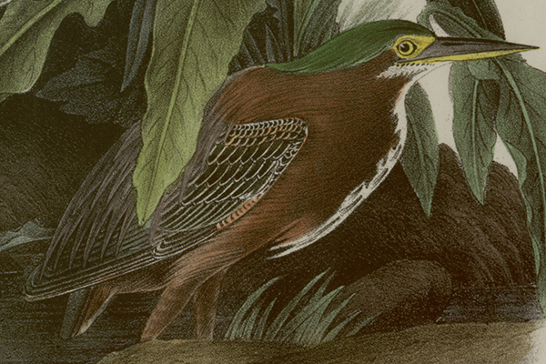 “The Green Herons feed all day long . . . [on] frogs, fishes, snails, tadpoles, water-lizards, crabs, and small quadrupeds . . . During the love-season they exhibit many curious gestures, erecting all the feathers of their neck, swelling their throat, and uttering a rough guttural note like qua, qua, several times repeated by the male as he struts before the female. . . . The flesh of this species affords tolerable eating, and Green Herons are not infrequently seen in the markets of our southern cities, especially of New Orleans.”
