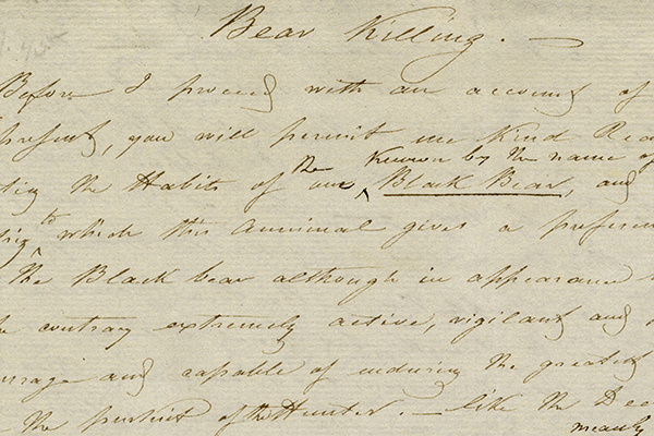 This manuscript, here labeled “Bear Killing,” was printed as “Scipio and the Bear” when it was published. The story presents a vivid depiction of a gruesome hunt, in which the hunters, who originally set out to save a field of corn from marauding bears, in fact destroy far more than the bears would have done.