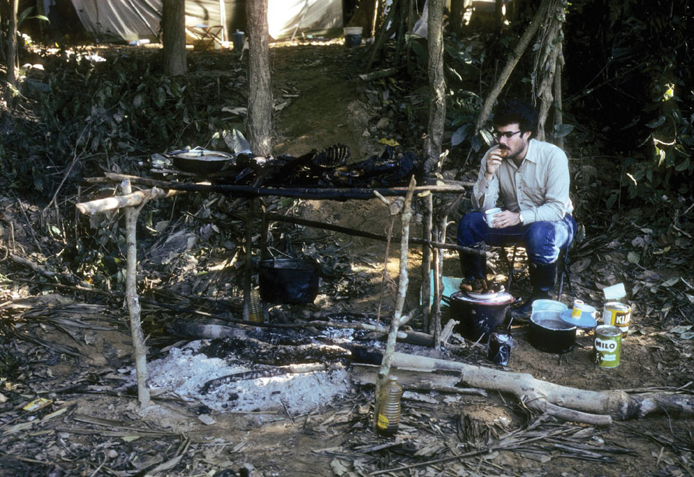 A young John O’Neill in 1977, camped by the Rio Heath on the border between Peru and Bolivia. The animal roasting on the makeshift grill is a tapir. The pot and other paraphernalia at O’Neill’s feet are ingredients for hot chocolate, a beverage he considers indispensable to happy camp life. Once, when asked what he most feared in the jungle, O’Neill replied, “Running out of sugar.”