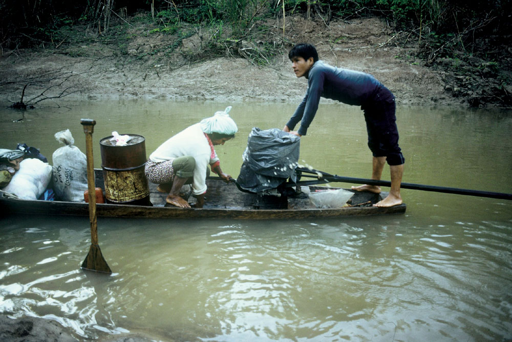 Transportation on the Rio Shesha, Peru, during a 1987 expedition memorably described in Don Stap’s A Parrot without a Name (New York, 1990). The river runs near the base of the Cordillera Divisor, on the border between Peru and Bolivia; studying the unknown fauna and flora of these remote mountains was the goal of the journey. Stap called the river, which was running low, a veritable obstacle course, filled with submerged logs, sandbars, and tangles of brush. The dugouts were propelled by a straight-shafted prop attached to a lawnmower engine; neither the motors, nor their reckless operators, were reliable. During the two-day trip up the river mishaps were frequent, with bags of equipment and provisions floating down the river, chased by frantic members of the expedition. By the time the group reached camp, nearly all of their gear was soaking wet. . .” (ibid., 176). Unfortunately, the lush scenery and abundant wildlife experienced by Weid are gone; today the Rio Doce valley is almost completely deforested.