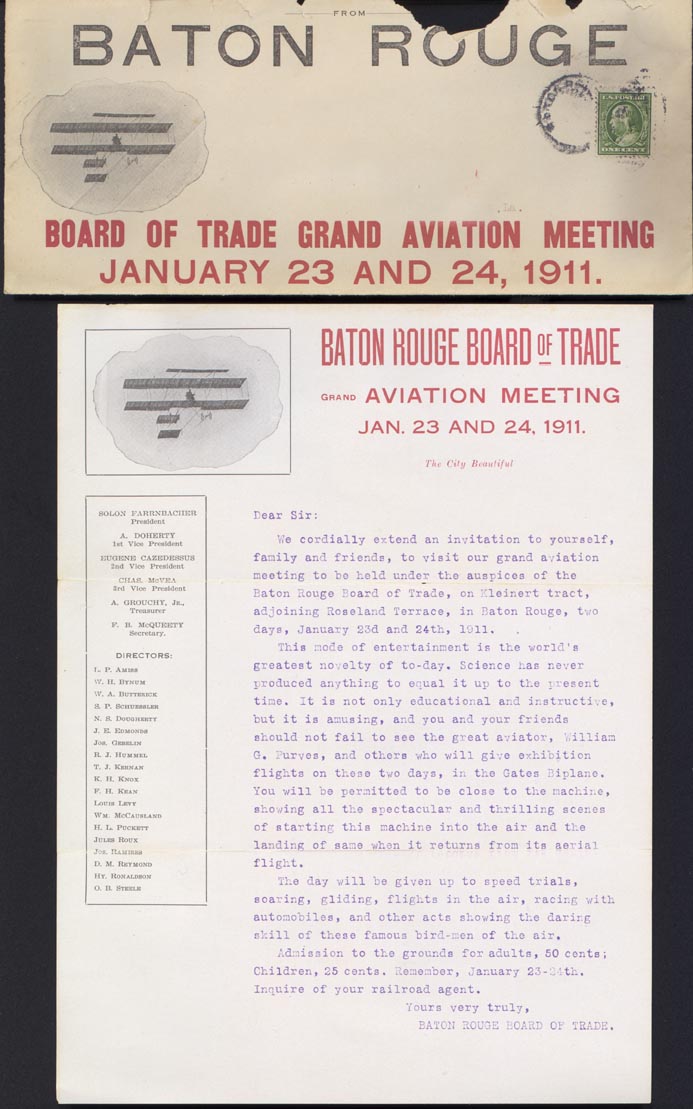 An invitation to the Grand Aviation Meeting in 1911 sponsored by the Baton Rouge Board of Trade shows a group determined to bring the latest technology to Baton Rouge. From 1911 to 1941 only private planes flew in or out of the city. World War II brought the construction of Harding Field, a fighter-training base north of town. When the war ended, the city took possession of the airbase, which became a commercial facility renamed Ryan Airport. Today it is known as the Baton Rouge Metropolitan Airport and is serviced by four carriers.