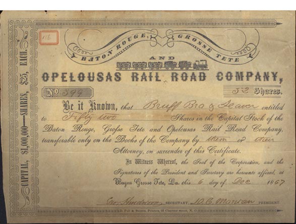 Limited rail transport came close to Baton Rouge in 1857. Private subscriptions and a $50,000 bonus from the city of Baton Rouge paid for the construction of the Baton Rouge, Grosse Tete, and Opelousas Railroad to serve the large sugar plantations west of the river. The rails ran only from Port Allen to Grosse Tete. Despite the issuance of stock certificates in 1867, the railroad did not survive the Civil War. Southern Pacific purchased its rails and rolling stock and took them away for use elsewhere.