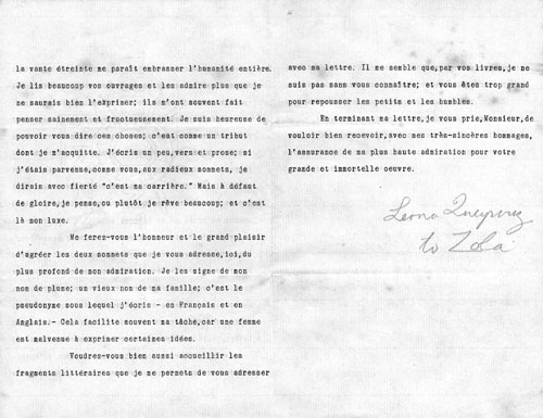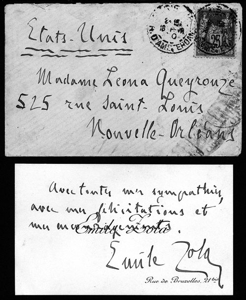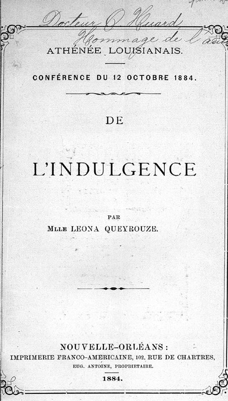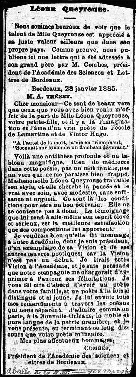 In 1880 Léona Queyrouze published her "Étude sur Racine" ("Essay on Racine") in Les Comptes-Rendus de l'Athénée Louisianais. At the age of 23, Queyrouze tested the limits of contemporary tastes by giving a lecture at the Athénée Louisianais on the subject of "Indulgence" , the first public speech given by a young Creole woman in Louisiana. Word of Léona Queyrouze's literary abilities and bold personality soon reached France, where a Mr. Combes, president of the Academy of Sciences and Letters in Bordeaux, wrote a letter praising her talent. Combes' letter was published in L'Abeille on March 1st 1885 . A fervent admirer of the renowned French writer Émile Zola, Queyrouze wrote a letter to her idol that boldly included one of her poems. Zola took the time to send her a few lines in response. In 1886 Queyrouze spent a year in New York translating and adapting French dramas for the American stage. Back in New Orleans again, she gave a lecture on "Wagner and patriotism" which illustrated her wide ranging interests. The audience at this lecture included General Beauregard, Louis Placide Canonge, Alfred Mercier and Charles Gayarré, the patriarchs of the defense of the French language in Louisiana. But at 41, Léona Queyrouze once more defied the mores of Creole society by marrying quite late in life. She abandoned her literary ambitions for many years until, late in her life, she published an essay in English entitled The Idyll: my Personal Reminiscences of Lafcadio Hearn (1933). Queyrouze died in 1938 at the age of seventy-seven.