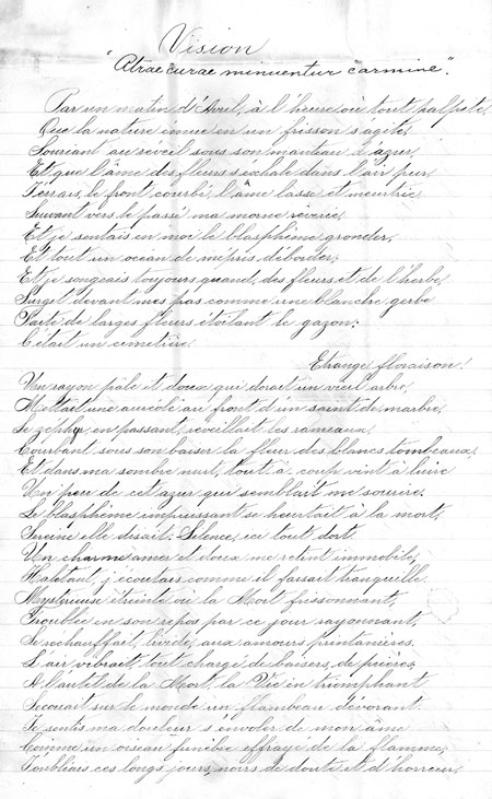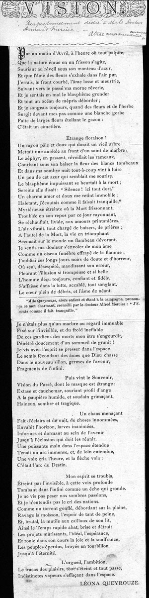 Léona Queyrouze was born in New Orleans in 1861 to a wealthy Creole family. Her father was the son of a veteran of the Napoleonic wars who immigrated to New Orleans and sold wine and groceries imported from France. Her mother was a Creole from Saint Martinville. As she grew up Queyrouze’s parents held salons at their home that attracted the luminaries of the Creole intellectual world. Because she joined adult conversations at a very young age, the precocious Léona earned the nickname "little Mme de Staël," a reference to the woman writer who then enjoyed enormous popularity in France and Europe. At 15 Queyrouze’s parents sent her to France to improve her skills in the French language. Soon after she returned to Louisiana, she befriended the locally famous writer Lafcadio Hearn, forming a partnership that would play a great role in her future literary career. Their relationship soon became the talk of the town. Hearn encouraged her to write and he read her first poems. Queyrouze soon published poems in L'Abeille, which she signed with her male pen-name: Constant Beauvais--the name of her grandfather, a former Louisiana governor. "Vision", here displayed in manuscript and published versions, was one of her most well-known poems. From an early age, Léona Queyrouze was surrounded by older men who were at the same time her mentors, confidants or suitors. Her correspondence with Victor Cousin, a man forty years her elder, is typical of her relationships with the men in her life. When he first met her in 1881, Cousin recited the following lines to her:
