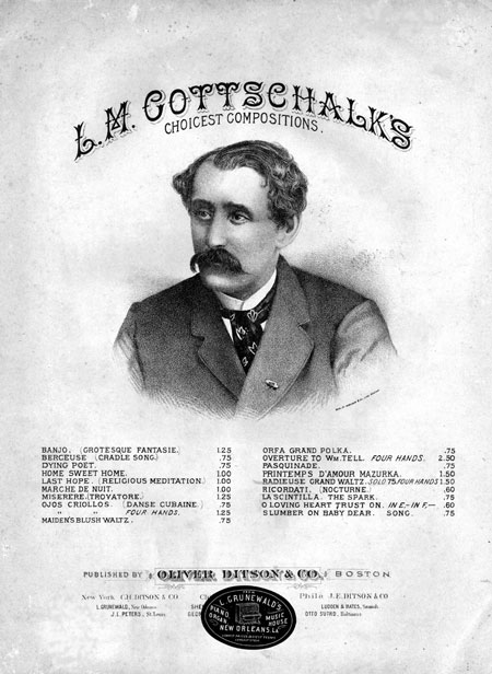 Louis Moreau Gottschalk , the first American pianist and composer to achieve international fame, was born in New Orleans in 1829. His Creole mother and British father raised him in an environment full of contrasts. In the first years of his musical education in New Orleans, Gottschalk was influenced by the diverse culture of New Orleans, as “Le Bananier” (“The Banana Tree” and “Bamboula, Danse des Nègres” (“Bamboula, Negro Dance”), would later show. In 1842, at the age of 13, he went to Paris to pursue his studies and soon entered the elite circles of French culture, rubbing elbows with Victor Hugo, Alphonse de Lamartine, Frédérique Chopin, Jacques Offenbach and Hector Berlioz. During his first years in Paris, the young Gottschalk gave many public recitals. The novelty of his work, which displayed influences from the black and Creole cultures of New Orleans, earned Berlioz’s admiration. In 1846 and 1847 the two musicians performed together for a series of concerts at the Théâtre des Italiens. Before returning to America in 1853, Gottschalk performed hundreds of concerts in the major cities of Europe. While he had been praised in Paris as “the Louisiana pianist and composer,” Gottschalk realized upon disembarking in New York that his fame had arrived before he did. New York in turn brought him success and glory, but the death of his father brought Gottschalk new financial responsibilities, and he became the main bread winner for his large family. In 1854 Gottschalk traveled to Cuba to give a series of concerts. He went back to New York and became famous for his expensive piano lessons and adventurous love affairs. In 1857 he returned to the West Indies to begin a tour with Adelina Patti, the young singer who was later to perform with great success at the Theaters of New Orleans. Everywhere they traveled in Central and South America jubilant crowds greeted the pair. It was in the course of his five-year stay in the West Indies that Gottschalk started to keep a diary. His sister Clara later translated and published this diary under the title Notes of a Pianist. In Cuba, Gottschalk set up gigantic festivals and concerts during which he would perform such compositions as “La Fête champêtre cubaine” (“The Cuban Village Feast”), “La nuit des tropiques” (“The Tropical Night”), and “La Grande Marche” (“The Great March”). Adamantly opposed to slavery, Gottschalk renounced his loyalty to Louisiana and sided with the Northern cause before leaving Havana in 1862. During the Civil War, he toured frenetically around the United States, giving more than a thousand concerts between 1862 and 1865. While in California, Gottschalk was involved in a scandal with one of his students. The incident drove him back to Latin America in 1865 and he was never again to return to the country where he was born. Gottschalk’s life was characterized by intense travels, outstanding success wherever he performed and admission into the highest spheres of local societies. Gottschalk would often play concerts of his own music with immense orchestras of local musicians. He continued to compose new works throughout his lifetime and his published music sold well. Under the influence of Louis Fors, he became something of a local reformer, giving speeches in Buenos Aires or Montevideo about the advantages of the American public school system. In the spring of 1869 in Rio, he appeared weakened by an illness (probably yellow fever) that he had carried along with him most of his life. Gottschalk stopped his concert tour to rest. In November of the same year he collapsed over his piano in the middle of a concert. His doctor diagnosed an infection of the intestines and urged him to get some rest away from Rio’s heat. But on December 18, 1869, Gottschalk died at the age of forty. Rio gave him a majestic funeral but New York claimed his body the next year, and he was buried in Greenwood Cemetery in Brooklyn.