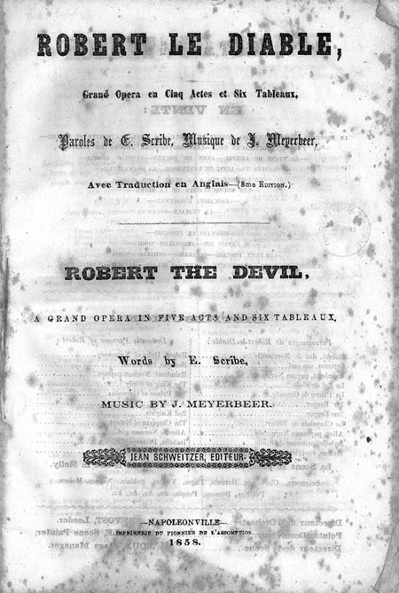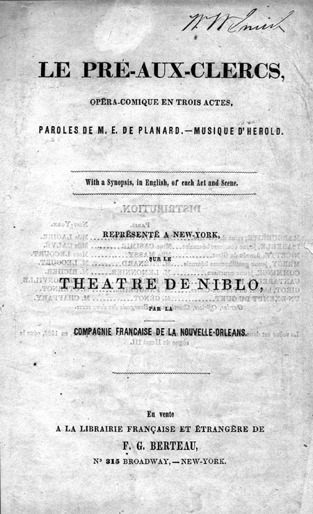 The rise and fall of French Opera in New Orleans frames the Nineteenth Century, from the first recorded performance of opera in the city in 1796 to the tragic burning of the French Opera House in 1919. In the early part of the century the New Orleans opera houses imported talented European musicians and singers and presented some of the finest opera in the United States. In 1796 Grétry’s “Silvain” was performed at the St. Peter Street Theater, the first recorded performance of opera in New Orleans. During the 1805-06 season the St. Peter Street Theater presented twenty-three performances of at least sixteen different operas to a city with a population of only twelve thousand people. Soon other companies were brought to the city and a rivalry developed between John Davis, a French-born refugee from St. Domingue who operated the Orleans Theater, and James Caldwell, an American who oversaw the Camp Street Theater. Competition between these theaters mirrored the tensions that existed between the Anglophone and Francophone sections of the city. Each group prided itself on the accomplishments of its opera troupe and boasted of the superiority of their artists. Giacomo Meyerbeer’s “Robert le Diable,” a perineal favorite, first premiered in New Orleans in 1835 at Caldwell’s Camp Street Theater, then opened six weeks later at Davis’s Orleans Street Theater. Critics from the French and English language press each claimed that their company’s performance of “Robert Le Diable” was far superior to the other’s. From 1827 to 1833 Davis traveled with a troupe of fifty performers to cities on the East Coast of the United States during the summer off-season in New Orleans. “Le Pré Aux Clercs” by Ferdinand Hérold was performed in New York by this “Compagnie Française de la Nouvelle Orleans.” Thus Creole New Orleans was, in this respect, an exporter of French culture to the rest of the United States.