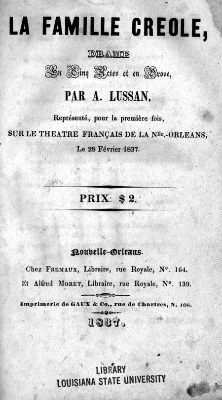 Creole New Orleans prided itself on its literary, theatrical and musical institutions-- the city supported several French-language newspapers; ballrooms thrived in a city obsessed with dancing; book and music publishers distributed Francophone cultural production to a larger audience; and several French-language theaters and opera houses nurtured the Creole love of high French culture. Auguste Lussan, a French poet and playwright who came to New Orleans in the 1830s to pursue his acting career, wrote La famille créole (The Creole Family). The play opened on February 28, 1837, at the French Theatre of New Orleans and was later published by one of the many French-language presses in the city. This five act drama alternately set in France and Louisiana, tells the story of a family of slave-holding refugees from the Revolution in St. Domingue (Haiti) that find in Louisiana a haven from both the upheaval in the Caribbean and the French Revolution. The existence of the French-language institutions in New Orleans gives the impression of a coherent “creole” population--a Creole Family-- united by a common language and culture. But a closer examination of these literary, musical, and theatrical works shows the conflicted and precarious status of Creole cultural production in New Orleans.