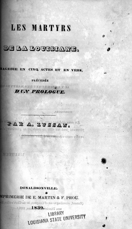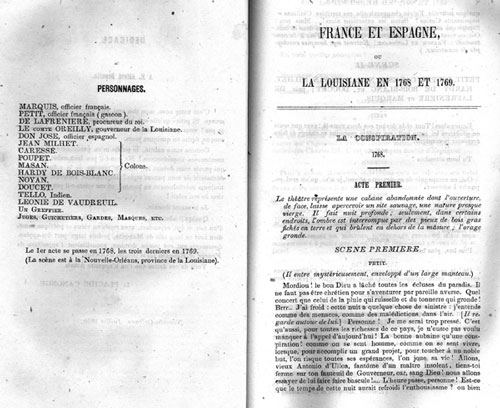 As historical events, the 1764 transfer of Louisiana from France to Spain, and the 1815 Battle of New Orleans were vital to the historical imagination of Creole New Orleans. Two plays written and produced in New Orleans--Les Martyrs de la Louisiane (1839) by Auguste Lussan and France et Espagne, ou La Louisiane en 1768 et 1769 (1850), by Louis Placide Canonge-- were based on the events of the 1768 revolt by French colonists against Spanish rule and the subsequent execution of the leaders of this revolt by the Spanish Governor O’Reilly. Written at a time when the economic and social power of Anglophone New Orleans began to eclipse that of the Francophone sections of the city, the two plays present patriotic Creole characters battling against the tyranny of an invading culture. In the first act of France et Espagne, we see a patriotic call to arms in a speech by Marquis, a French officer: