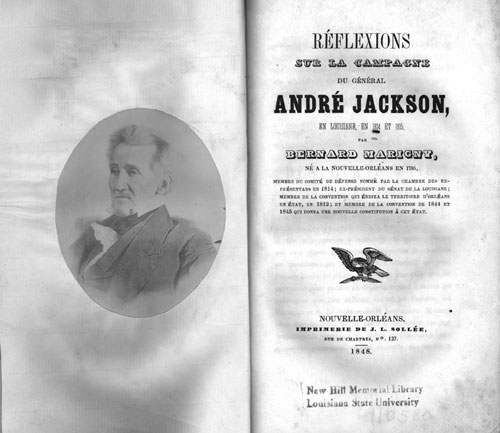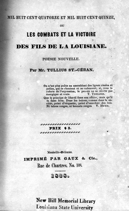 The characters in the plays reject Spanish rule and declare that the executed leaders of the revolt are martyrs for the cause of Creole Louisiana. Mil Huit Cent Quatorze (Eighteen-Fourteen) by Tullius St. Céran (1839), a book of poems about the Battle of New Orleans, and Refléxions sur la Campagne du Général André Jackson (Reflections on General Andrew Jackson’s Campaign) by Bernard Marigny (1848), a memoir of a veteran of this battle, demonstrate the importance that Andrew Jackson’s victory held for Creole New Orleans. These two works at once emphasize the Creole contribution to the American victory over the British at Chalmette, and contrast Francophone Louisianians with their English-speaking brothers in arms. Marigny’s memoir of the battle also describes an incident at a ball shortly after the Louisiana Purchase in which a group of Americans insisted that the musicians play a rill or a jig instead of the waltzes and cotillions that the Creoles preferred. A high-born Creole lady argued that during the thirty years of Spanish domination, New Orleans Creoles were never forced to dance the fandango, and that she expected the same respect from the newly-arrived Americans. The representation of these two events, these two creole foundation myths, demonstrates a conflicting impulse to both celebrate the Creole contribution to the American cause and to emphasize and reinforce the differences between the Creoles and their neighbors.