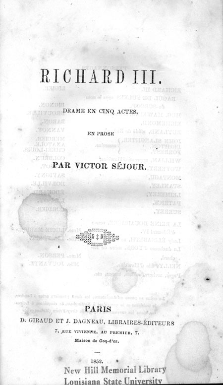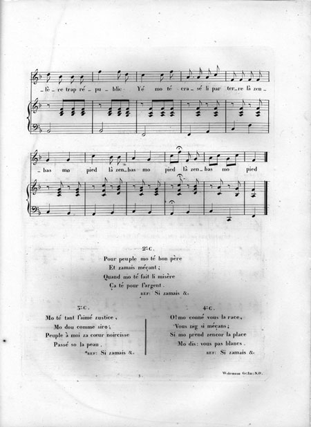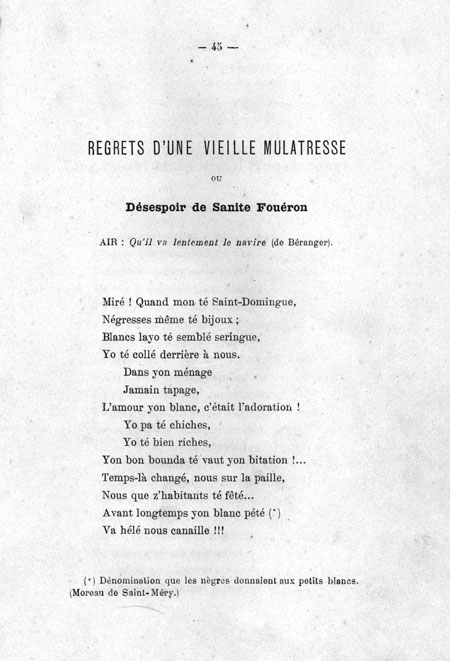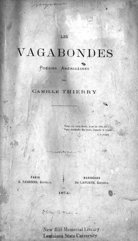 Colonial New Orleans, like many other slave holding societies in the New World, had a three tiered racial system in which free people of color enjoyed a middle position between whites and black slaves. Its large population of gens de couleur libres or free people of color (20,000 in 1840) made New Orleans unique among American cities and became a source of conflict between the Francophone and the rapidly growing Anglophone sectors of the city. While many of these free people of color traced their heritage back to colonial Louisiana, the arrival of free black refugees from the revolution in Haiti served to reinforce their numbers in Louisiana. The achievements of many of the city’s free people of color were described in Rodolph Desdunes’s 1911 book Nos Hommes et Notre Histoire (Our People and Our History). Politicians, soldiers, poets, and playwrights, the free people of color defended their tenuous middle status between white and black. Important among the musicians and writers of this group were Armand Lanusse, Louis Charles Roudanez, and Basile Barès. Some free black New Orleanians left the city for successful careers in France. Victor Séjour wrote twenty-one plays during his career as a playwright, most of which, like Richard III, debuted in Paris. Edmond Dédé received his early musical education in New Orleans, but left Louisiana for further study at the Paris Conservatory and a career as conductor and composer in Bordeaux. Camille Thierry found success in Paris with his work Les Vagabondes, Poésies Américaines (The Vagabonds, American Poetry)(1874). Desdunes book celebrated the achievements of previous generations of free black New Orleanians at a time when his own generation was taking the lead in fighting against Jim Crow segregation in the South.