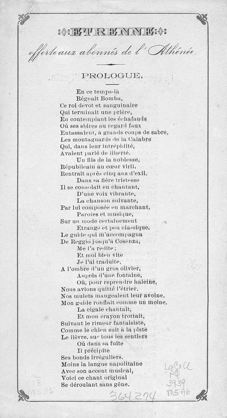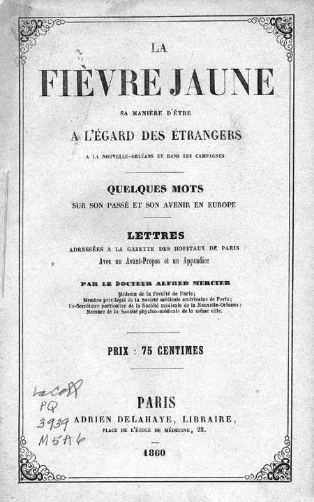 Alfred Mercier was born in Louisiana in 1816. His family, immigrants to Louisiana from South-West France, sent him to Paris at a very young age for his education. While he attended the prestigious Collège Louis le Grand and then went on to law school, he felt a greater love for literature than for the law. After several years spent in Louisiana and Boston, Mercier left in 1842 for a grand tour of Europe. His five-month stay in Italy and Sicily provided him with the inspiration for a novel he would publish in 1873, Le Fou de Palerme (The Fool of Palermo). During the 1848 Revolution in France, he contributed articles to Louisiana newspapers about the events leading to the crowning of Napoleon III. He also married the daughter of the owner of his boarding house after a long and serious illness from which she helped him to recover. At 33, Mercier began his medical studies in Paris. After graduating, he moved his family back to New Orleans where he established his medical practice. During the Civil War Mercier returned to Paris and played an important part in efforts to convince France to support the Confederacy. Back in New Orleans again after the war, Mercier wrote reviews of performances given at the French Opera House for the New Orleans Picayune. A great lover of literature, Mercier spoke several languages and devoted himself to the preservation of the French language in Louisiana. He was a founding member of L'Athénée louisianais, and served as the organization’s secretary and treasurer until his death. In an article entitled "Progrès de la langue française" ("Progress of the French Language"), published in Les Comptes-Rendus de l'Athénée louisianais in September 1883, Mercier forecast the extinction of Francophone New Orleans in this nostalgic yet visionary prediction: