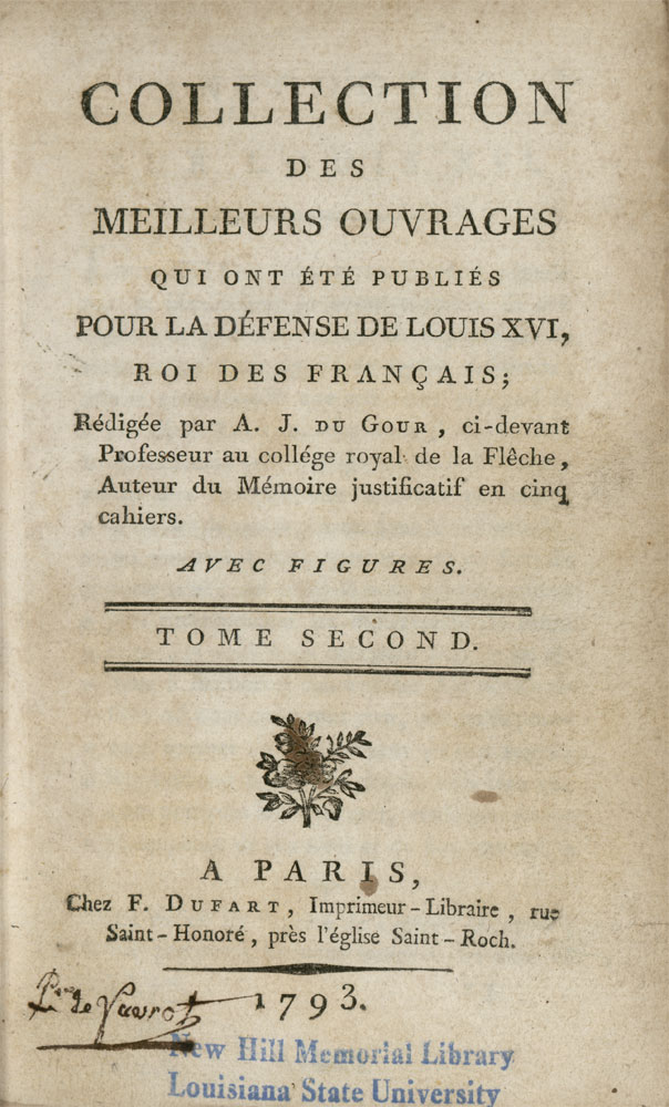 Antoine Jeudy Du Gour, Collection des meilleurs ouvrages qui ont été publiés pour la défense de Louis XVI, roi des Français. Paris: F. Dufart, 1793.