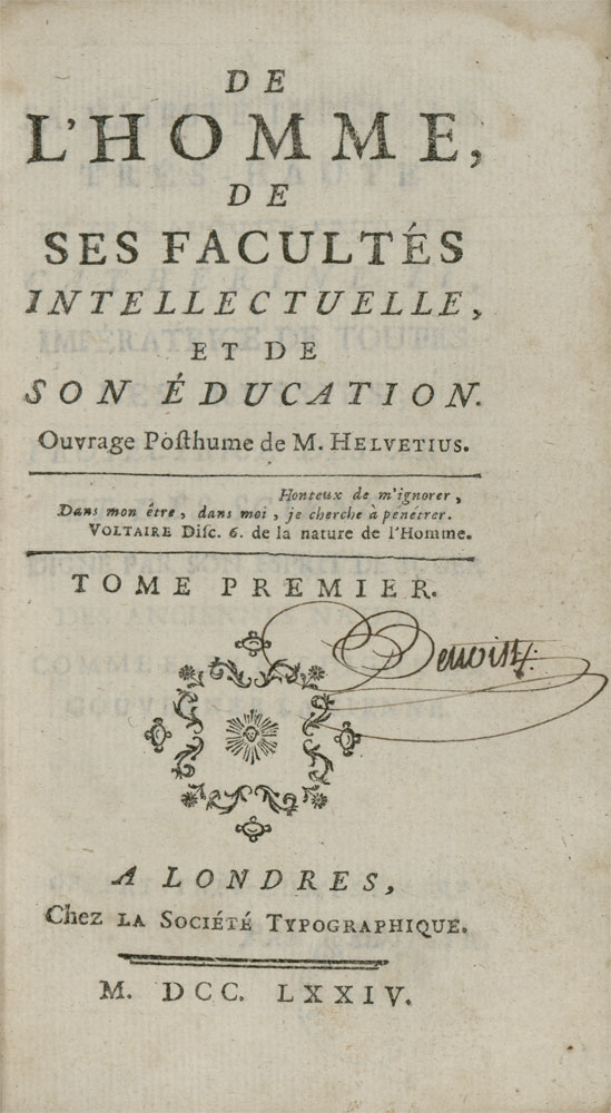 The books were some of the finest products of the French Enlightenment and included fourteen finely bound volumes of the Comte de Buffon’s Histoire naturelle, works on minerals, navigation and mathematics, and writings of French philosophers like Helvétius and Marmontel. Benoist’s son Robert (1795-1819), who graduated with a master’s degree from Princeton in 1816, may have used them in his studies. After Robert’s untimely death, they made their way to Rosedown Plantation in St. Francisville, Louisiana, where his widow Rosina lived for a time with her cousin Martha Turnbull.