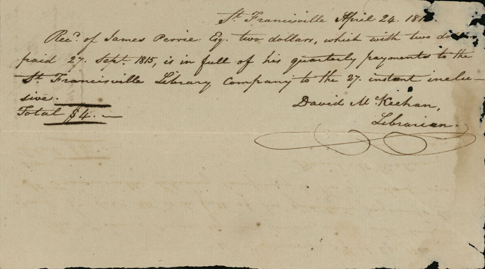 The library company’s first librarian was David McKeehan, best remembered today as the publisher of the journal of Patrick Gass, a member of the Lewis and Clark Expedition. A schoolteacher and lawyer by training, McKeehan lost his hearing in 1801 and opened a book and stationery store in Pittsburgh, where he met Gass, transformed his journal into flowery prose, and published it. Meriwether Lewis was furious, believing it would detract attention from his own soon-to-be-published account. In the end, sales of Gass’s work were disappointing. Facing mounting debts, McKeehan moved to Natchez and then to New Orleans, publishing newspapers in both cities. By 1816 he was in St. Francisville working as a scrivener in a law office and as librarian of the town’s new subscription library.