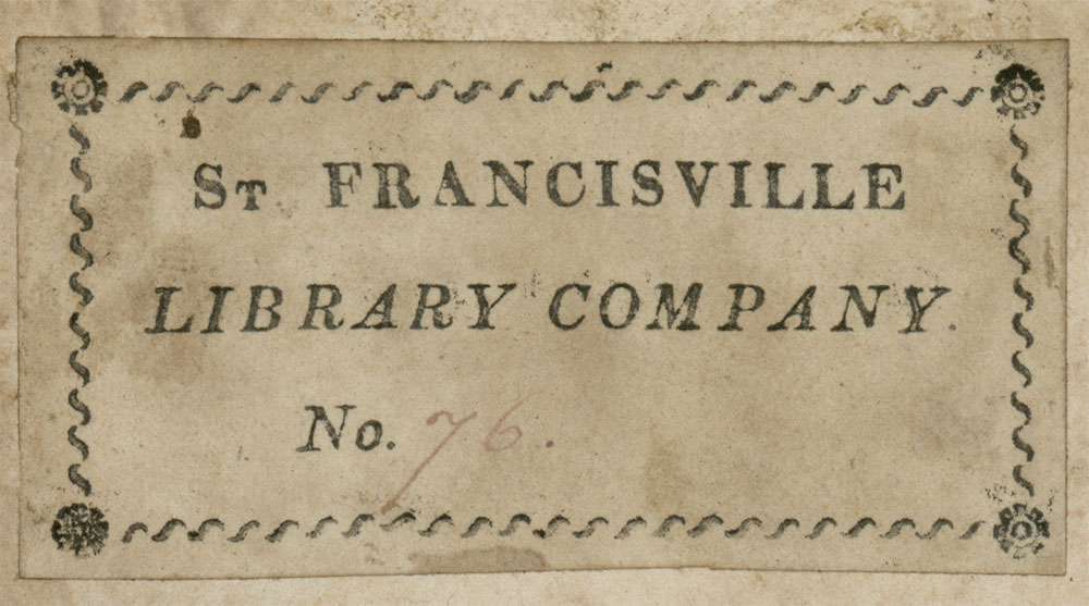 Little evidence remains as to the size and scope of this collection. The numbered bookplate shown here indicates that the volume containing it was number 76 in the library’s collection. Holdings of just a few hundred titles would not have been unusual for a library in a town of St. Francisville’s size. By comparison, in 1814 a subscription library in Cincinnati contained 300 volumes, and although slightly different in nature, a circulating library that opened in 1821 in nearby Baton Rouge—which was then only slightly larger than St. Francisville—offered access to 153 titles (226 volumes) for a small fee. Even in New England, small-town libraries of this sort sometimes owned 100 or fewer books.