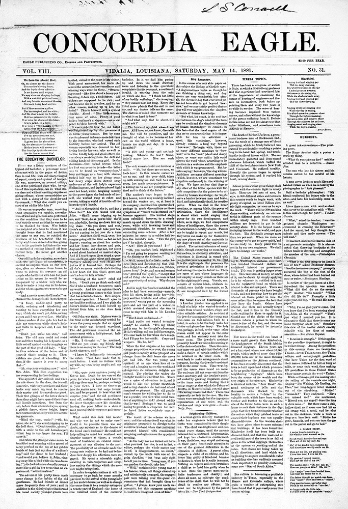 In 1892, May Edna Leake and her husband William Walter Leake founded the Bayou Sara True Democrat to “make war” on the Louisiana Lottery, a private corporation that provided revenue for Louisiana but was seen as a corrupting influence on state government. Mrs. Leake managed the paper on her own after her husband’s death in 1901. In 1906, she married her pressman, Elrie Robinson, who later gained some recognition as an expert on the reproduction of old typefaces. The True Democrat, which Leake edited until her death in 1925, came to be recognized as one of the South’s finest “country journals.”