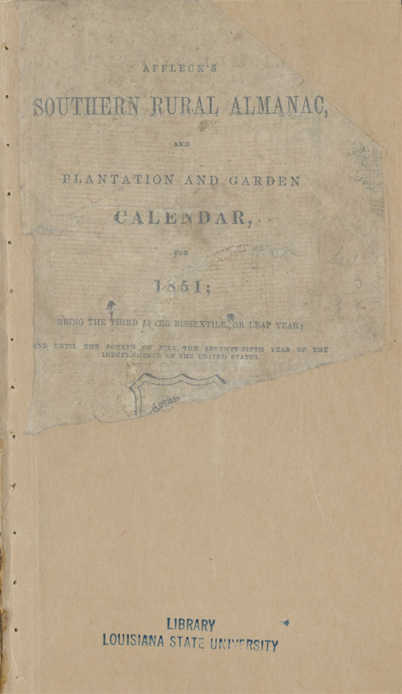 Thomas Affleck, Affleck’s Southern Rural Almanac and Plantation Garden Calendar. Washington, Miss.: Thomas Affleck, 1851.