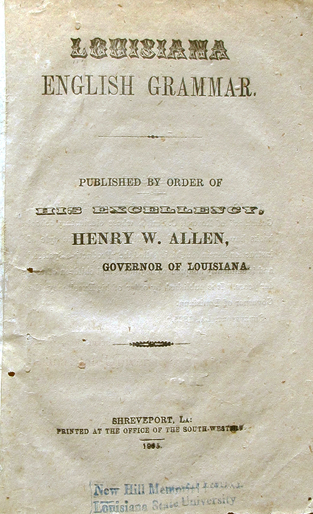 Even though Louisiana was partially occupied by Union troops for most of the Civil War, areas of the state that remained in the Confederacy tried to get on with life as best as they could. The war interrupted the flow of books from the North, where all the major publishing houses were, leaving many Louisiana children without textbooks. Despite shortages of paper, Governor Henry W. Allen authorized the printing of the Louisiana English Grammar in Shreveport, the last Confederate capital of Louisiana, in 1865. Edited by Allen’s secretary, Edmund Halsey, a former newspaper publisher, the work was adapted from Roswell C. Smith’s popular New English Grammar. The paper may have been imported from Mexico.
