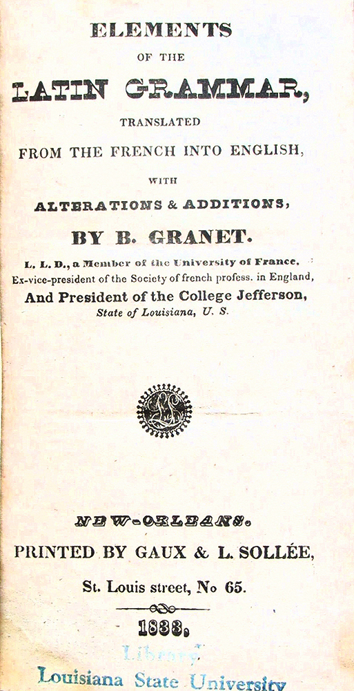 Newspapers from this period frequently contained advertisements for language tutors. Students also would have owned dictionaries and grammars, such as those shown here. The French-Spanish grammar was originally designed for use at the College of Orleans, Louisiana’s first institution of higher learning, which opened in 1811. Cherbonnier’s French grammar could be used by children or adults. It begins with a lesson on the alphabet and pronunciation of letters, contains a section on how to keep account books and write business letters, and ends with samples of French poetry. Early Louisiana libraries were often well stocked with the Greek and Latin classics; the state’s many Catholic schools also created a market for Latin grammars like the one shown here, printed in New Orleans in 1833.