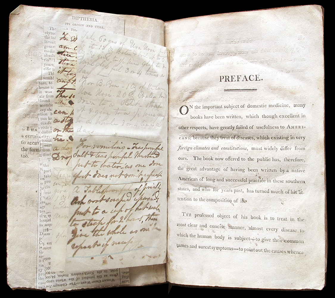 This copy of Ewell’s guide was owned by Martha Turnbull of St. Francisville, Louisiana, and contains many handwritten notes about remedies she employed. Well known as a gardener—The Garden Diary of Martha Turnbull, Mistress of Rosedown Plantation was published by the LSU Press in 2012—these annotations reveal that her garden was valued not just for aesthetic enjoyment and food, but also for medicinal purposes. Some of the notes may refer to treatment given to the Turnbulls’ more than 400 slaves.