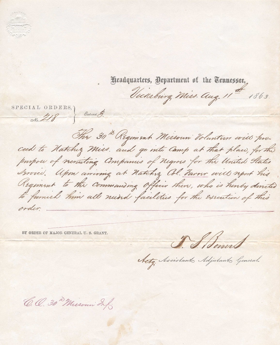 1. Special Order No. 218, August 11, 1863, directing the 30th Regiment Missouri Volunteers to recruit African-Americans at Natchez for service in the Army. By this time, the actions of the Louisiana Native Guards at Port Hudson had proven the valor and commitment of African-American soldiers. Their success in battle tipped the opinion of the Northern public, Federal officials, and military strategists in favor of recruiting blacks for the Army.