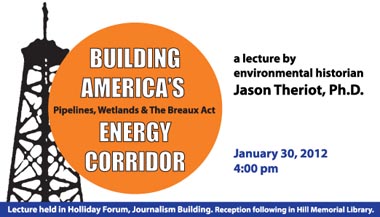 Environmental historian Jason Theriot will present "Building America's Energy Corridor: Pipelines, Wetlands, and the Breaux Act" on Monday, January 30, at 4:00 in the Holliday Forum of the Journalism Building.