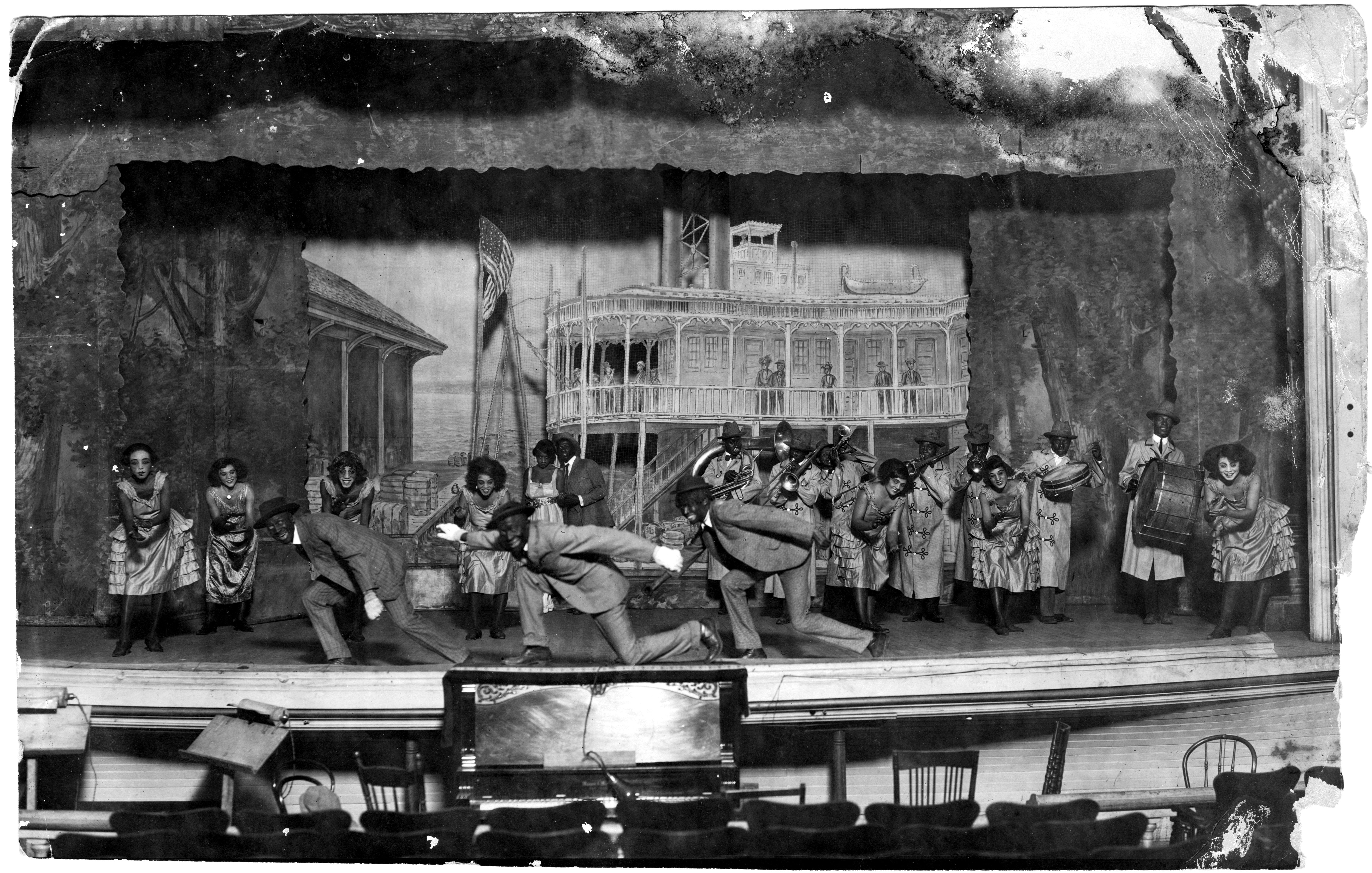 The other production appears to have a “showboat” theme, given the painted backdrop showing a steamboat at the dock with the cast arrayed in front of it. Here again, the cast is in a mix of black-face and white-face with a seven-piece band on stage with the cast. The Band members are not made-up but all the members are African American. From the format and some evidence internal to the images, these theater images probably date from around 1910 to 1920.