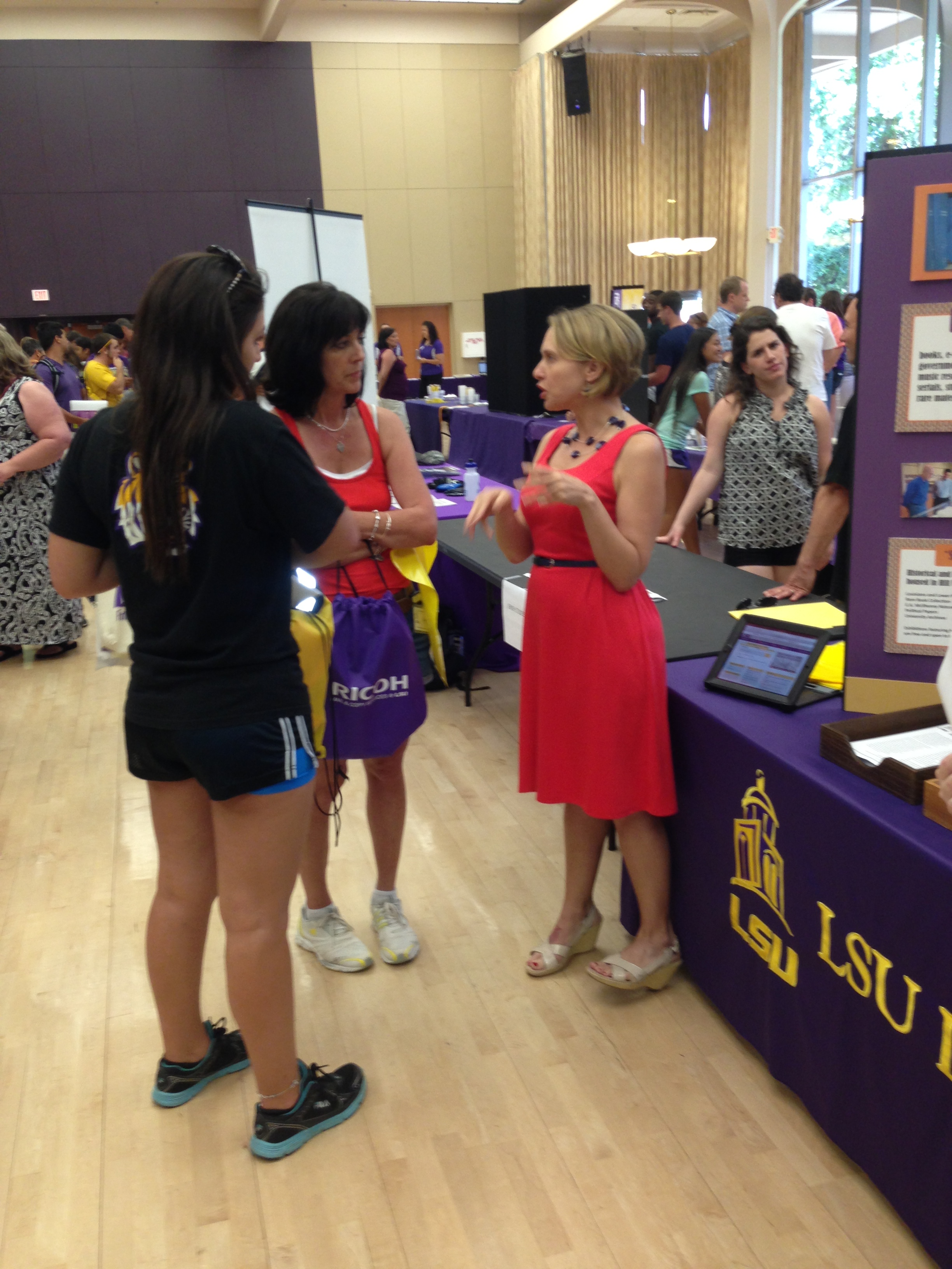 LSU Libraries are currently participating in freshmen orientations throughout the summer in two ways. Through the Office of Orientation, information fairs are being held in the Cotillion Ballroom for hundreds of freshmen students who are beginning their studies at LSU this fall. Along with a multitude of other departments and services around campus, volunteers from the LSU Libraries speak to students and parents about the myriad of services that the LSU Libraries have to offer, such as LIS 1001, Special Collections, subject librarians, electronic resources, and much more.