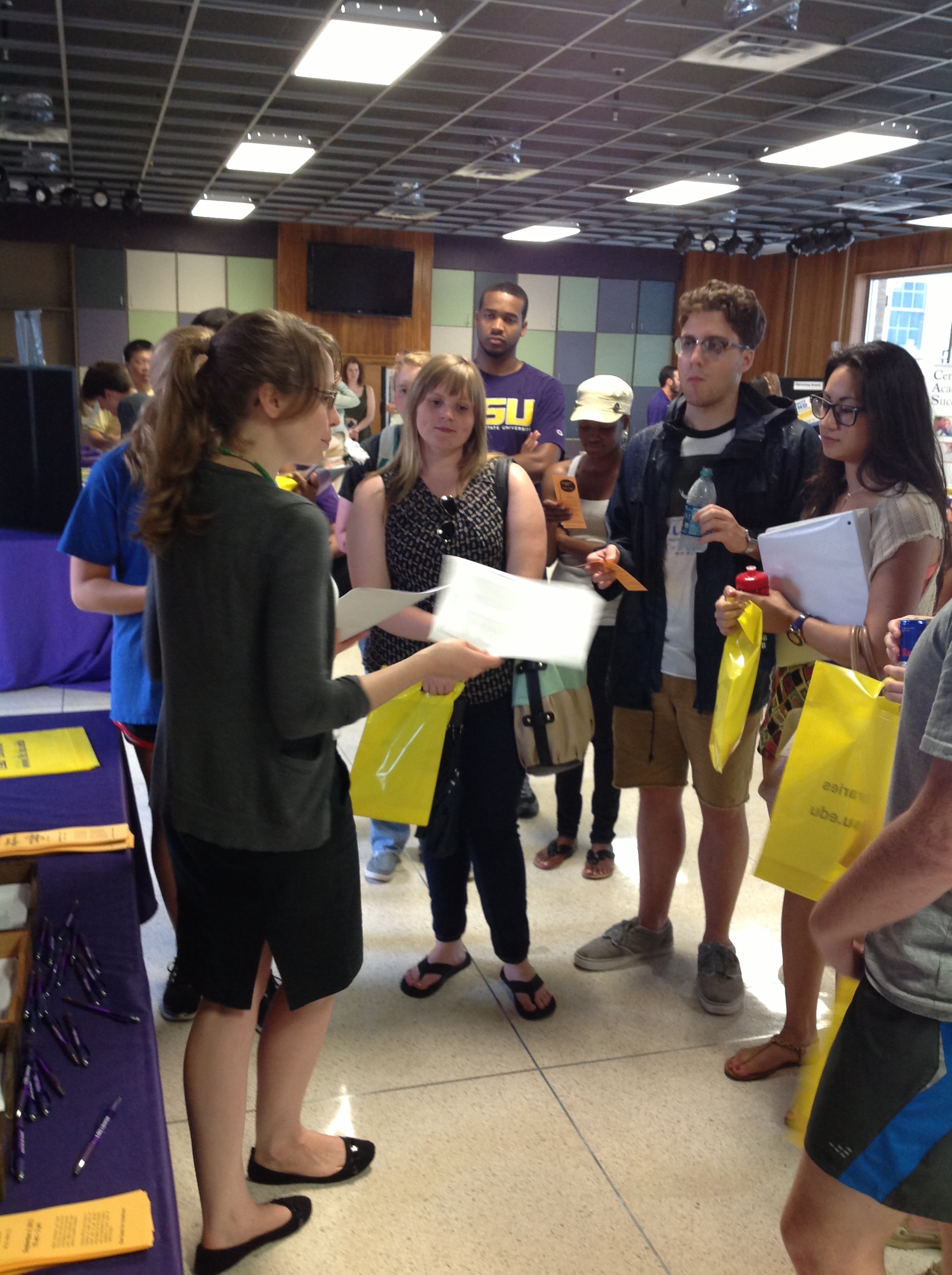 On Monday, August 12th, Emily Frank, Instructional Technologies and Engineering Librarian, and Mitch Fontenot, Outreach Librarian, met and presented to 210 LSU Resident Assistants in Broussard Hall through the RA Resource Fair. Under the theme “The Amazing Race,” this information fair made Resident Assistants aware of the many services available to them and their residents throughout the school year. Representatives from other campus entities, such as Career Services, the University Recreation Center, First Year Experience, and Student Health Center, were available to talk to the Resident Assistants and distribute information. On behalf of LSU Libraries, Mitch and Emily met RAs, promoted the upcoming Meet Your Librarian Day on September 4, and provided information about LIS 1001, electronic resources, and Special Collections.
