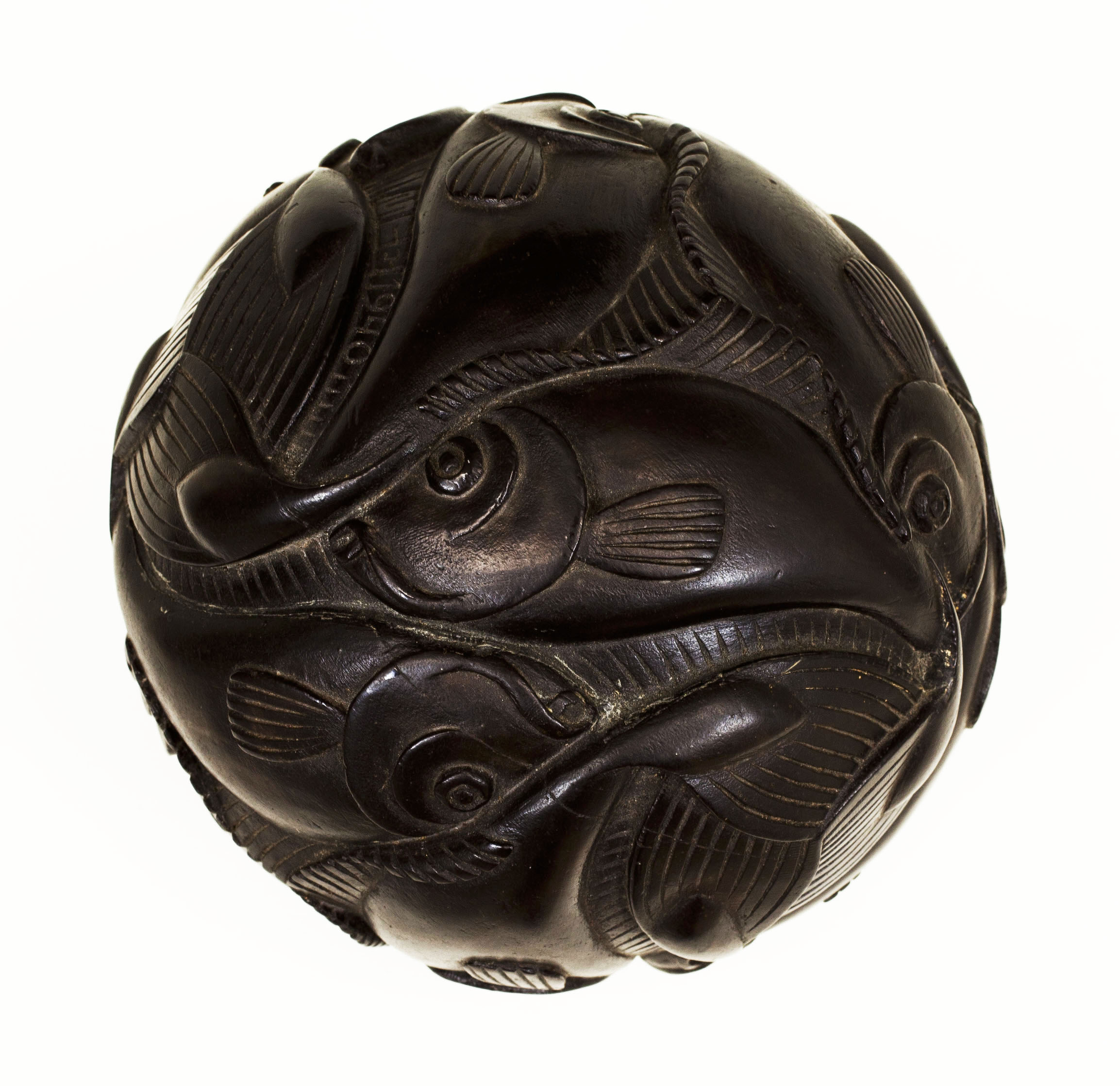 A coconut, the surface of which is carved with M. C. Escher’s tessellated fish . . .