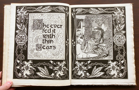 Another unique book in the library’s collection is Poems by John Keats (1897). Printed on Japanese vellum at the Chiswick Press, the edition is rare in its own right, but this particular copy is one of a kind, having been hand-colored by Gloria Cardew and bound in patterned leather by Annie S. MacDonald, a Scottish bookbinder affiliated with the Edinburgh Arts and Crafts Club and the Guild of Women Binders. (For more information on MacDonald, see Marianne Tidcombe’s Women Bookbinders, 1880-1920.)