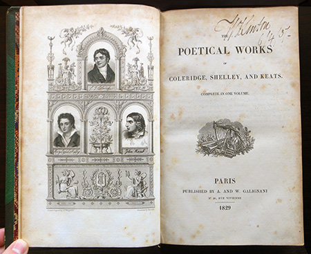 The earliest volume is The Poetical Works of Coleridge, Shelley, and Keats (1829). Only a few of Keats’s poems were published during his short lifetime, and although some came out after his death in 1821, this volume is the first collected edition of his works. It also has the added advantage of being an early anthology of poems by two of his contemporaries, Samuel Taylor Coleridge and Percy Bysshe Shelley. This particular copy is inscribed “W. J. Linton, 6/4/37” – possibly William James Linton, an engraver, political reformer, and publisher whose journal, The National, attempted to put good literature (including poems by Keats) into the hands of working-class readers.