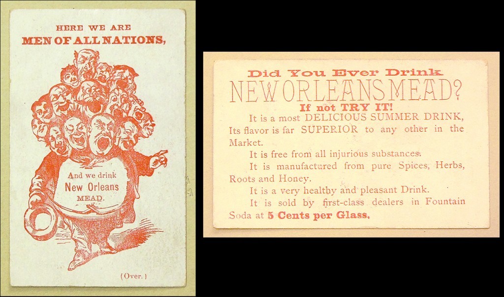Another item is an advertisement card for New Orleans Mead, a form of root beer that “is free from all injurious substances” (i.e., alcohol). Made with spices, herbs, roots, and honey, such drinks were popular in the nineteenth century when temperance activists blamed beer and other alcoholic beverages for all kinds of social problems from poverty to domestic abuse.