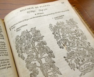 Sehr nützlicher Tractat von Bier-Brau-Recht (“A Very Useful Tract on the Laws of Beer Brewing”) was published in the German city of Regensburg in 1722. Its author, Johann Otto Tabor, was a law professor who wrote about regulations regarding the production and selling of beer. He also included an interesting chapter on beer’s history and its consumption by the Egyptians and Romans. (Special Collections also owns a Babylonian cuneiform tablet from ca. 3500 B.C., which is possibly a receipt for grain used to make beer.) Hops were being used to add flavor to beer at least as early as the eleventh century. They were first imported to England around 1400, but it wasn’t until the sixteenth century that they were grown there. John Ray, in his Herball, or Generall Historie of Plantes (1597), wrote that “The flowers [of hops] are used to season Beere or Ale with, and overmany do cause bitternes thereof, and are ill for the head.” However, he also noted that “The manifold vertues in Hops do manifestly argue the holesomnesse of Beere above Ale; for the Hops rather make it a Phisicall drinke to keepe the body in health, then an ordinarie drinke for the quenching of our thirst.”