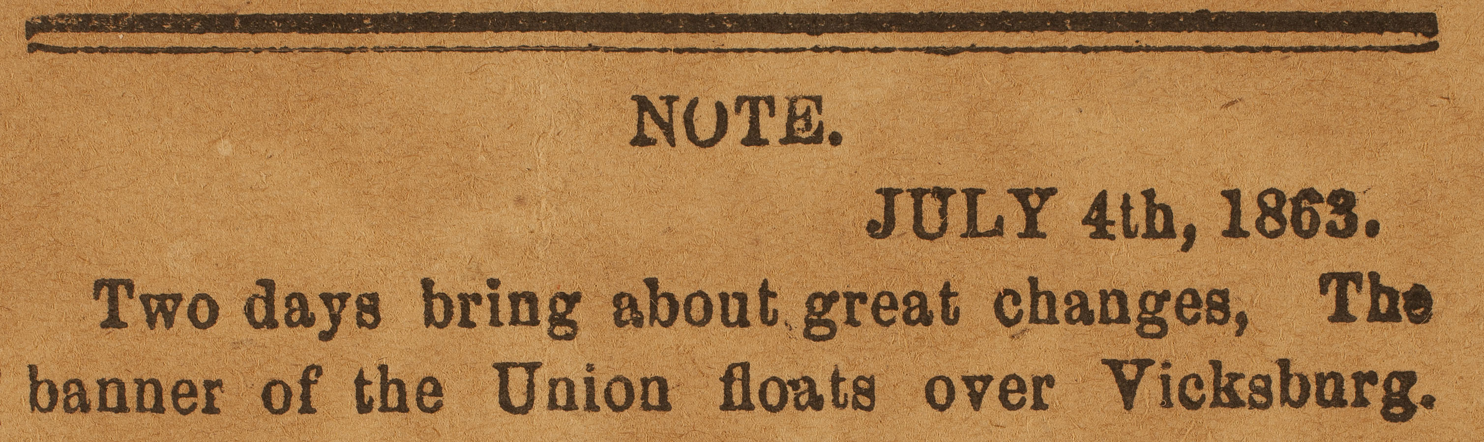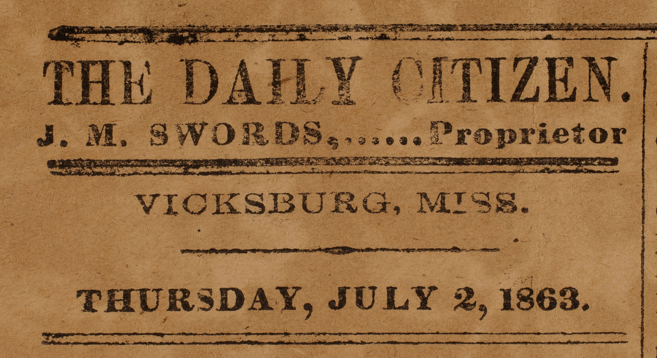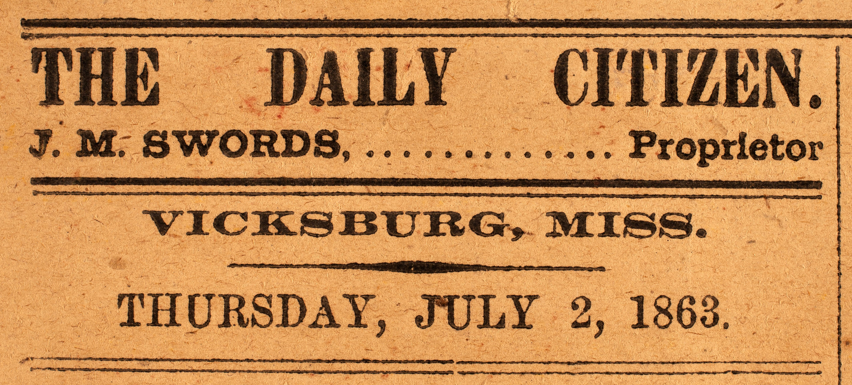 In 2010, a woman brought a copy of the July 2/4, 1863, edition of the Vicksburg Daily Citizen for an appraisal on the popular PBS series, Antiques Roadshow, at the time touring in Biloxi, Mississippi. An especially famous newspaper, this particular issue announced the fall of the city to Union troops on Independence Day, but it would become best known as the most renowned of the Confederate “wallpaper newspapers.” Midway through the war, when newsprint began to run low around the South, many small town publishers substituted the only paper available. Likewise, when surrounded by Federal forces and cut off from supplies of paper, the publisher of the Daily Citizen also had to settle for wallpaper to print six editions of his newspaper in the last days of the siege.