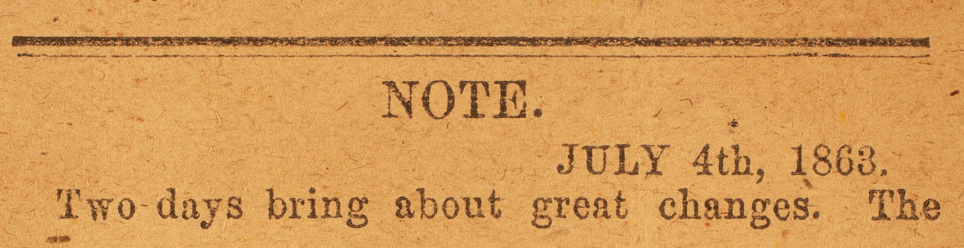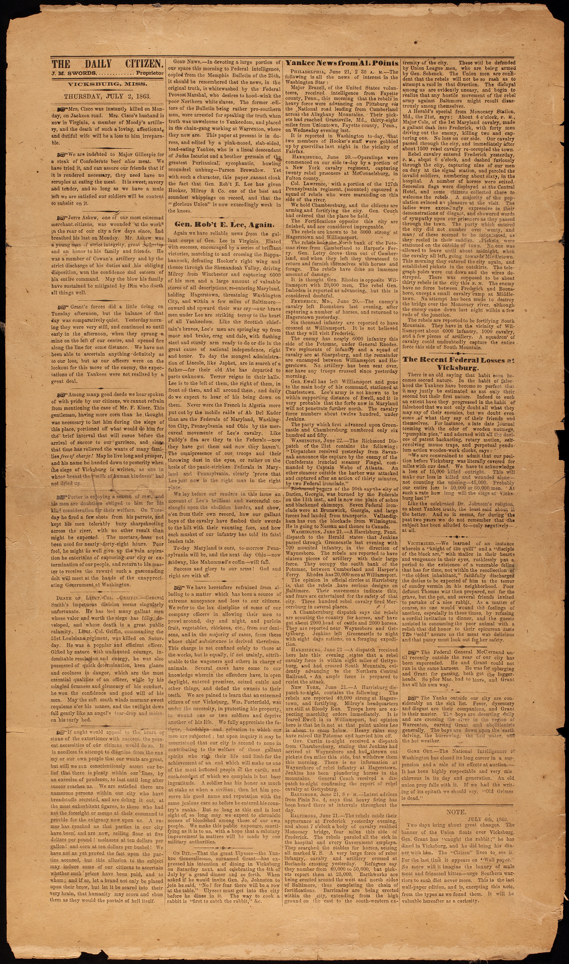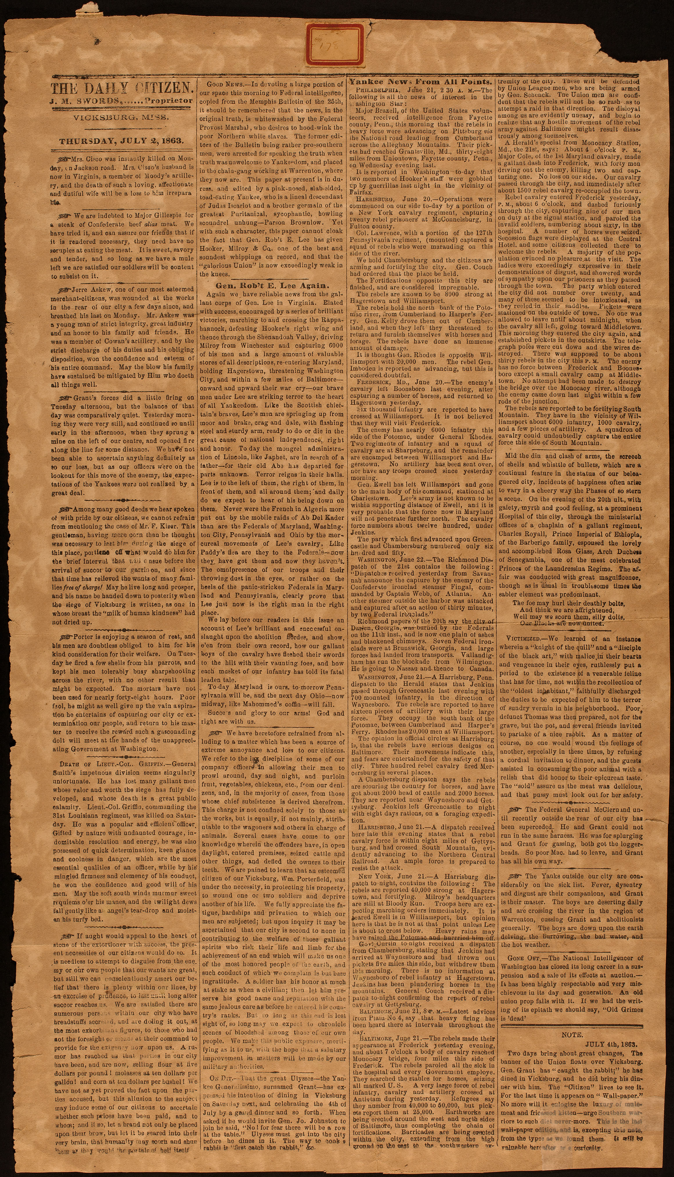 In 2010, a woman brought a copy of the July 2/4, 1863, edition of the Vicksburg Daily Citizen for an appraisal on the popular PBS series, Antiques Roadshow, at the time touring in Biloxi, Mississippi. An especially famous newspaper, this particular issue announced the fall of the city to Union troops on Independence Day, but it would become best known as the most renowned of the Confederate “wallpaper newspapers.” Midway through the war, when newsprint began to run low around the South, many small town publishers substituted the only paper available. Likewise, when surrounded by Federal forces and cut off from supplies of paper, the publisher of the Daily Citizen also had to settle for wallpaper to print six editions of his newspaper in the last days of the siege.